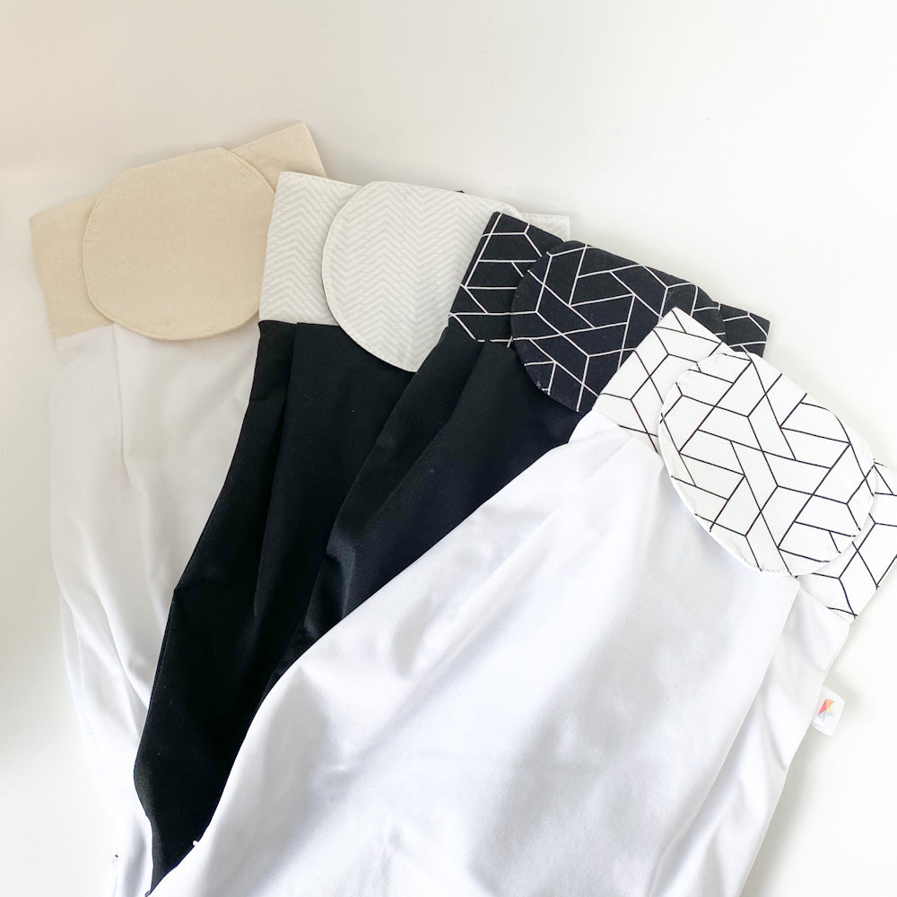 A Boaty kit includes a basket for storing the rolls and a matching bag for placing the used rolls while awaiting the next wash. The bag opens at the bottom with a zipper to easily release the rolls into the washer.